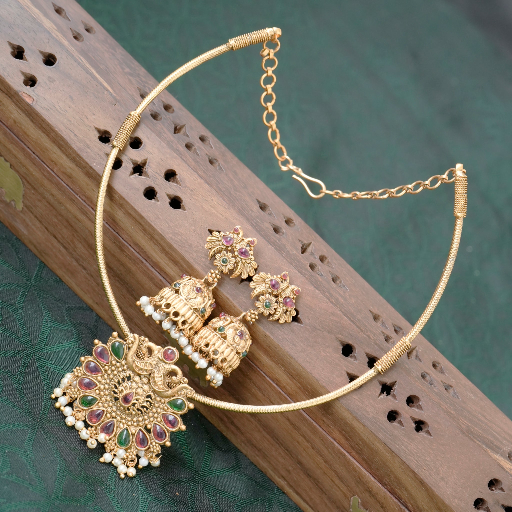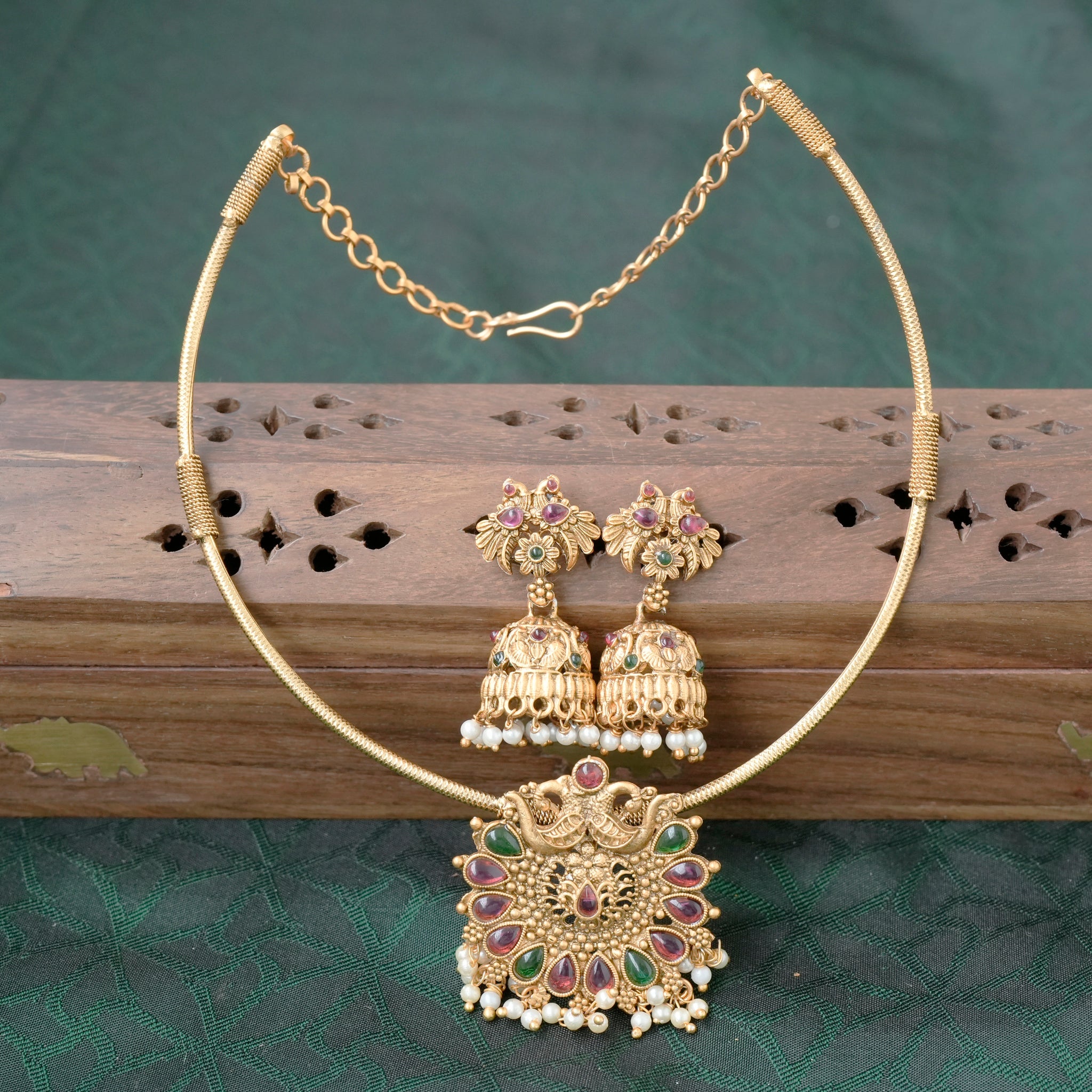 Budget Friendly Matte Finish Kemp Chakra Rettapakshi Hasli Necklace Set - 003