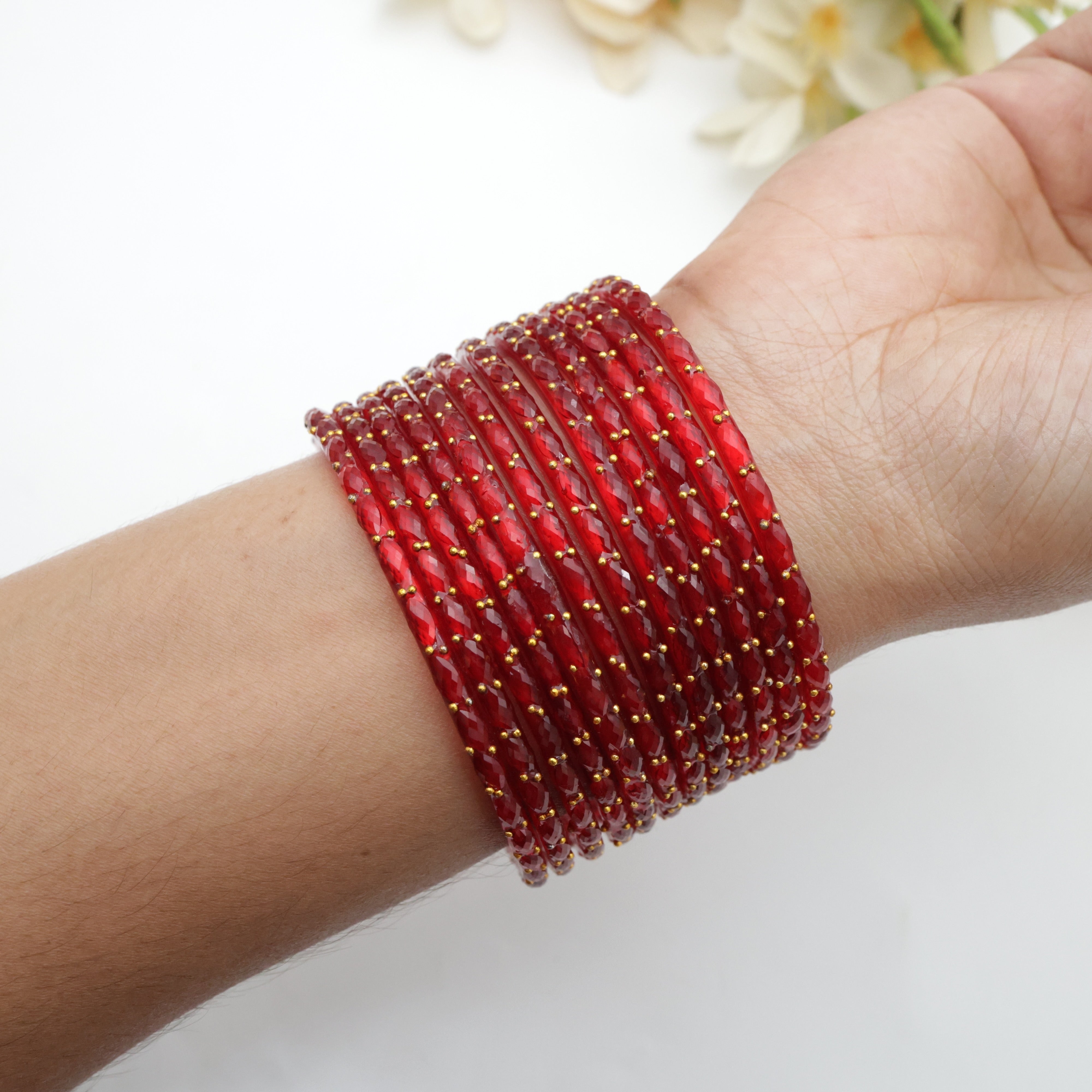 Add a touch of elegance to any outfit with our Raindrop Crystal Cut Glass Bangles in a vibrant red color, also known as "laal". The intricate design and high-quality materials make these bangles a must-have for any fashionista. Elevate your style with the perfect pop of color.